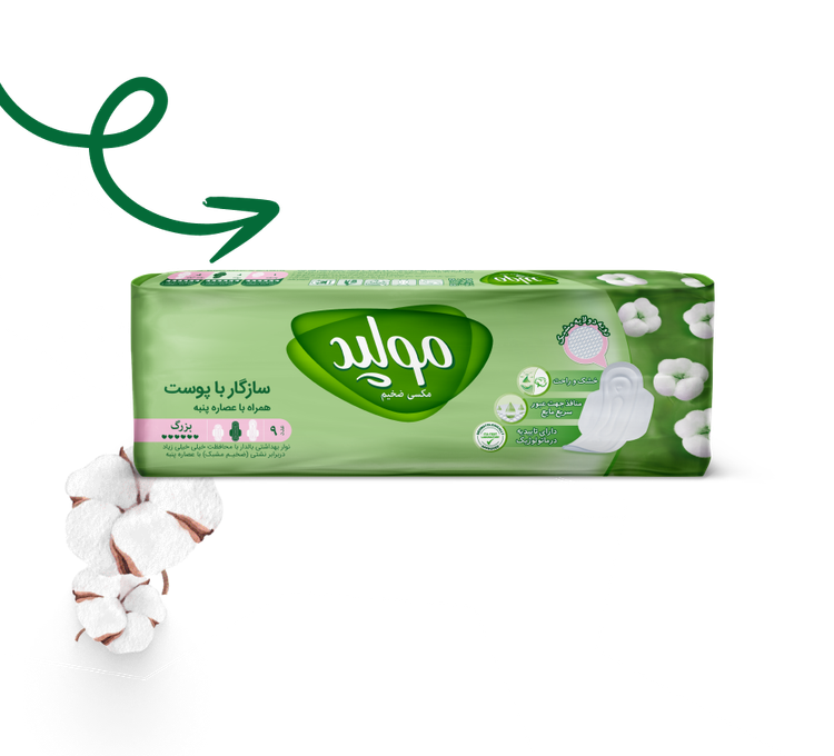 مولپد مکسی با لایه رویی بر پایه عصاره پنبه متناسب با پوست شما می باشد و در عین حال خشکی و راحتی را برای شما فراهم می کند. جذب بسیار بالا و تجربه ای بدون نشتی را به شما ارائه می دهد. مولپد مکسی از نظردرماتولوژیک تست شده و کاملاً سازگار با پوست است.